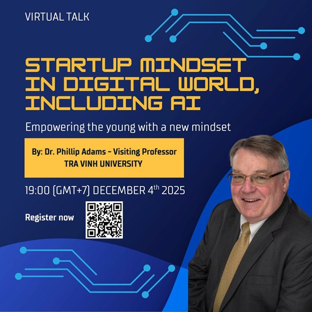 A virtual talk titled “Startup Mindset in the Digital World, Including A.I.” was delivered by Dr. Philip Adams, visiting professor at Tra Vinh University, on December 4, 2025, via the Zoom platform. Faculty members and students from Tra Vinh University, Southern Leyte State University, and Samar State University joined the virtual event to explore the fast-changing landscape of digital technology and artificial intelligence. Among the attendees from Samar State University were Dr. Elmer A. Irene (Director for International Affairs), Ariel N. Abarratigue (International Quality Assurance Staff), and Eloisa Baroga (a College of Education student).