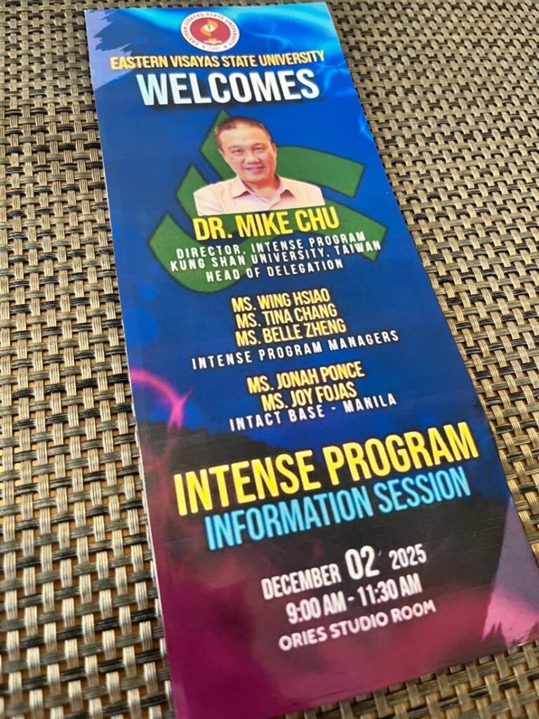 The program gathered representatives from SSU, Leyte Normal University, University of Eastern Philippines-Catarman, and Southern Leyte State University, along with faculty and students from EVSU. The KSU delegation was composed of Dr. Mike Chu and INTENSE Program Managers Ms. Tina Chang, Ms. Belle Zheng, and Ms. Wing Hsiao, together with representatives from INTACT Base-Manila, Ms. Jonah Ponce and Ms. Joy Fojas.